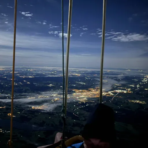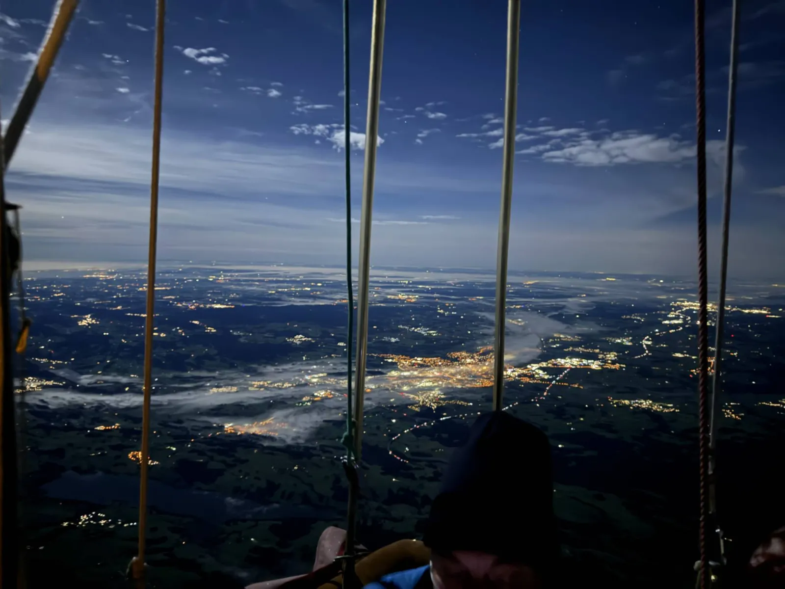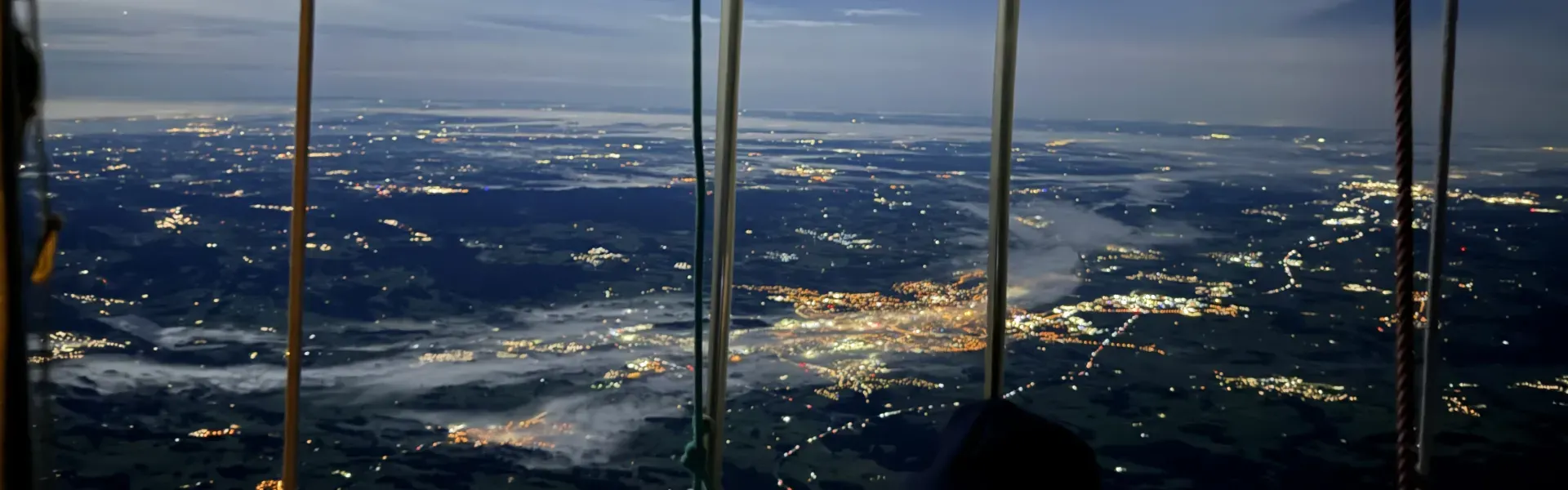 Gestern Nacht haben wir ein Abenteuer erlebt, das sich kaum in Worte fassen lässt. Um 2:30 Uhr hob unser Gasballon in Augsburg ab – unter einem hell leuchtenden Mond, der die Landschaft in silbriges Licht tauchte. Schon der Start war ein Moment voller Ehrfurcht und Aufregung. Lautlos schwebten wir empor, ließen die Lichter der Stadt hinter uns und stiegen auf 3000 Meter Höhe.