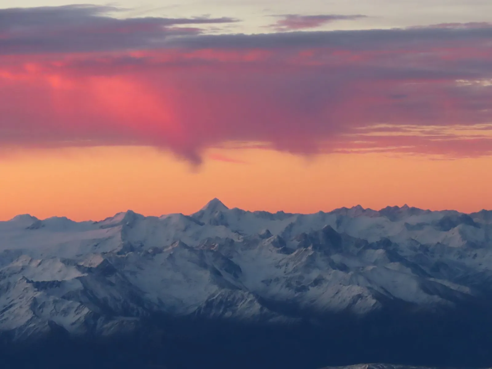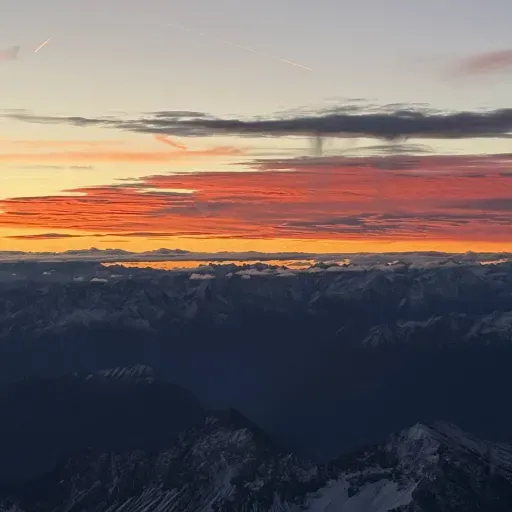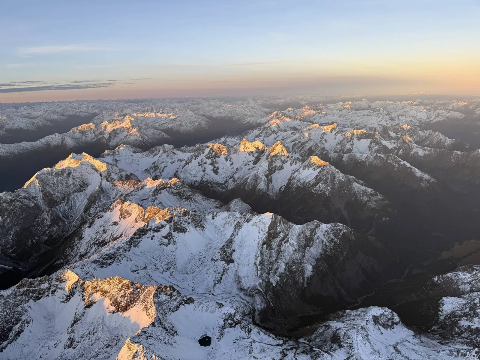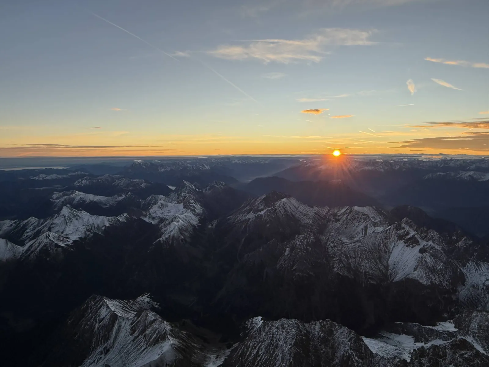 Die Koordination mit der Flugsicherung lief reibungslos, was uns zusätzliche Ruhe schenkte. Gegen Morgen erreichten wir die Alpen und stiegen weiter – hinauf bis auf 4800 Meter. Dort, über den Gipfeln, begann der Himmel sich zu verfärben. Zuerst ein zarter Schimmer am Horizont, dann flammte das Licht auf – der Sonnenaufgang über den Alpen.