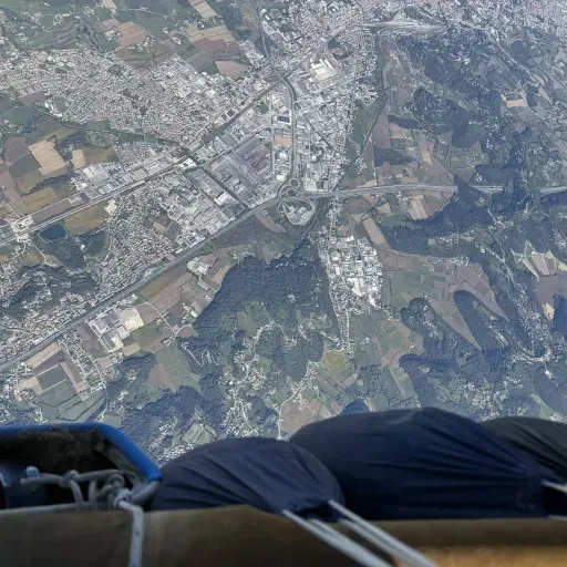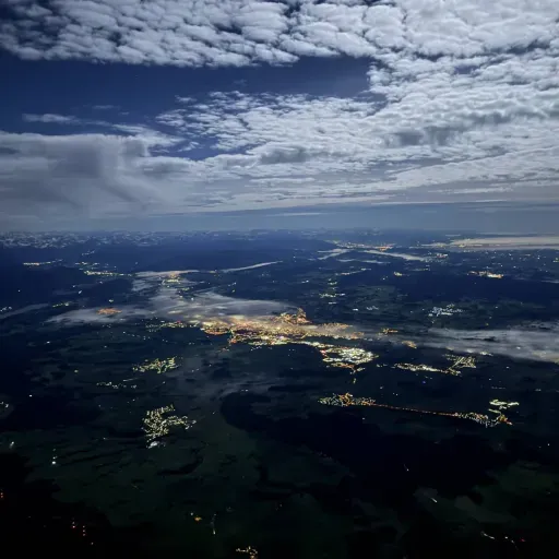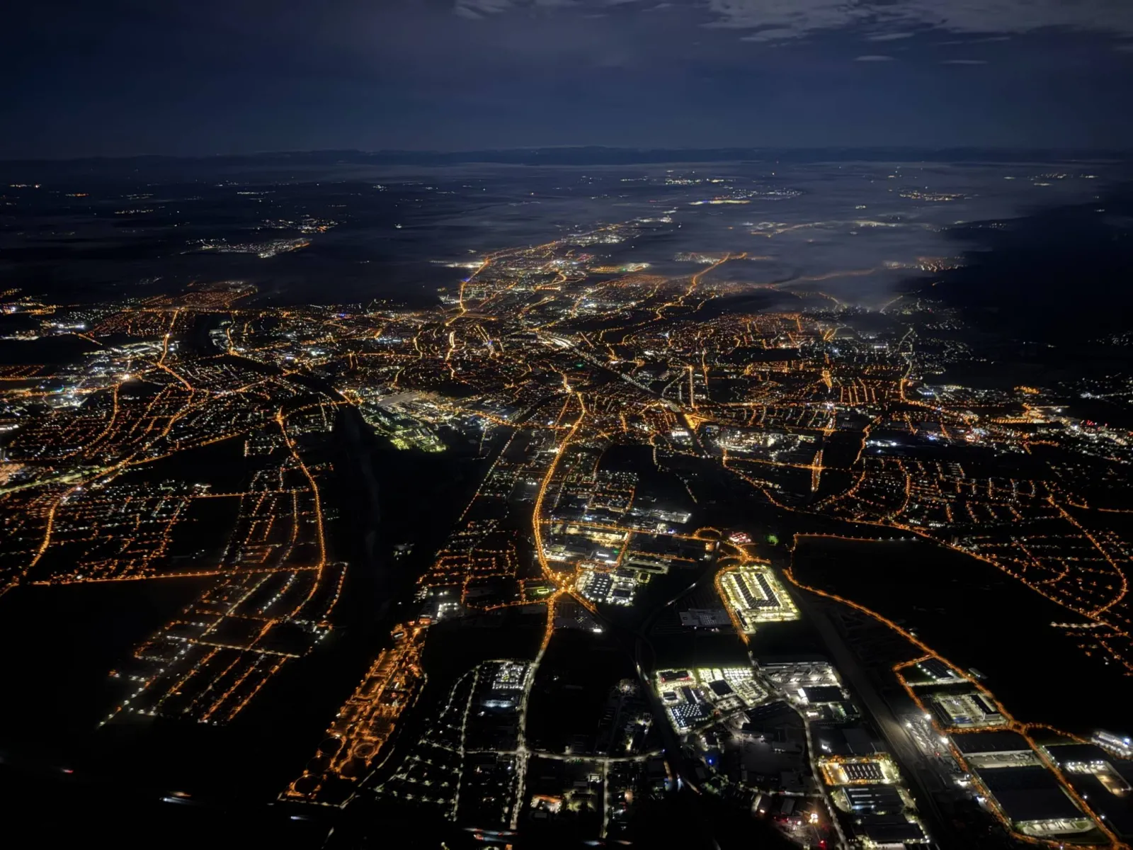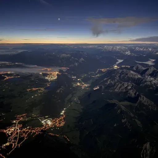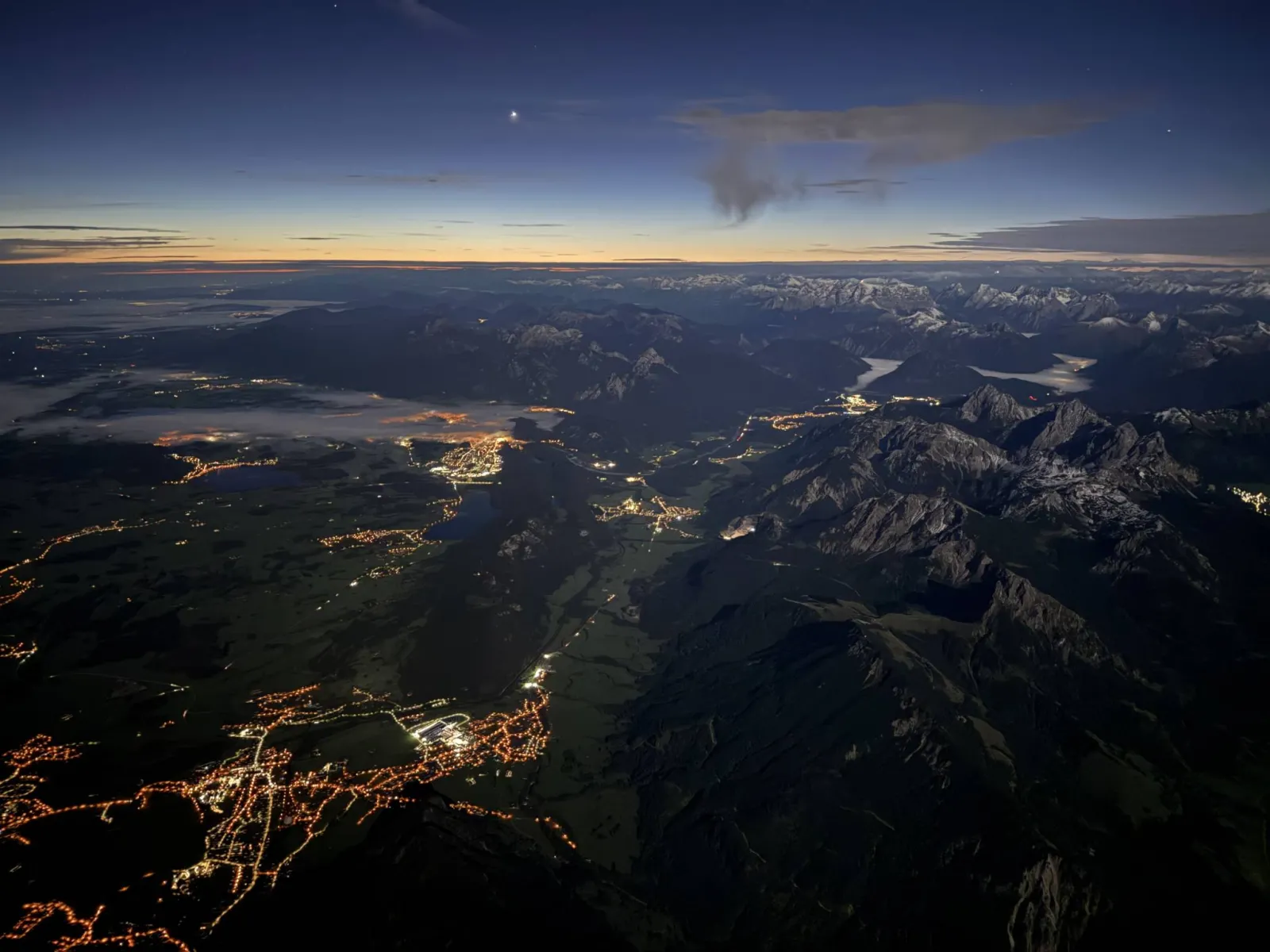 Unter uns lag das nächtliche Allgäu, friedlich und still. Über Kempten glitten wir dahin, begleitet nur vom sanften Getöse der fliessenden Gewässer und der funkelnden Sternenpracht über uns. Die Sicht war atemberaubend – die Welt schien endlos weit. Trotz der Dunkelheit erkannten wir Täler, Seen und Straßen, die wie helle Fäden durchs Land zogen.