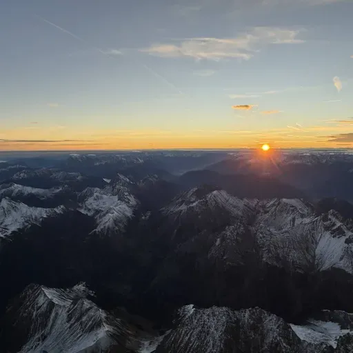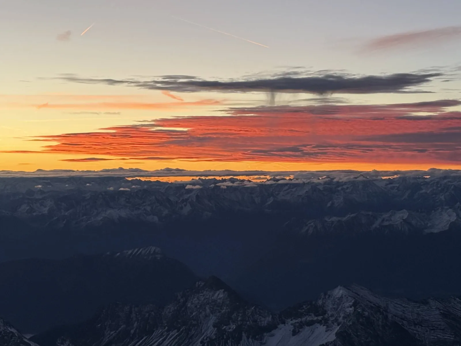 Die Koordination mit der Flugsicherung lief reibungslos, was uns zusätzliche Ruhe schenkte. Gegen Morgen erreichten wir die Alpen und stiegen weiter – hinauf bis auf 4800 Meter. Dort, über den Gipfeln, begann der Himmel sich zu verfärben. Zuerst ein zarter Schimmer am Horizont, dann flammte das Licht auf – der Sonnenaufgang über den Alpen.